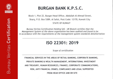 Burgan Bank has been awarded the ISO 22301:2019 certification for Business Continuity Management Systems (BCMS), recognizing the Bank’s strong risk management framework and its ability to maintain operations seamlessly during disruptions.